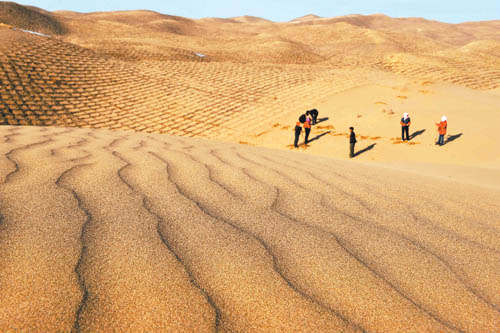 宁夏白芨滩林场职工在毛乌素沙漠边缘扎草方格(11月26日摄)。