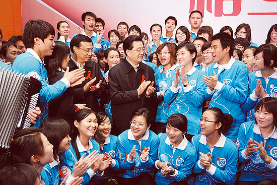 随后,胡锦涛又来到主题互动区。在防治艾滋病志愿者招募站,许多年轻人正在领取志愿者报名登记表。总书记走过去,向工作人员了解志愿者招募情况。北京中医药大学博士生刘丹彤去年参加了北京奥运会志愿服务,今天又申请成为防治艾滋病志愿者的一员。她对总书记说,做一名志愿者很光荣,我是学医的,愿意为防治艾滋病尽一份力。总书记笑着说:“你有无私奉献精神,有从事志愿服务经验,还有医学专业知识,相信你一定能成为一名优秀的防治艾滋病志愿者。”