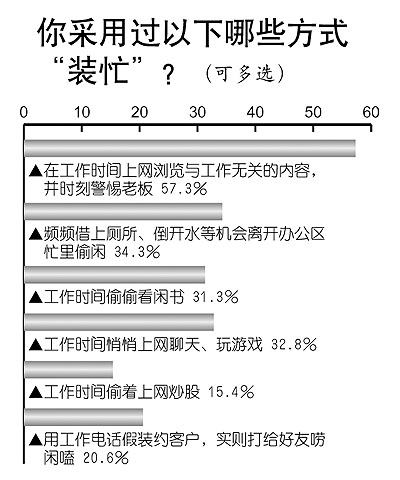 提到“装忙族”,还得从不久前流行于各大论坛的热帖《“装忙族”偷懒招数大曝光》说起。该帖详尽介绍了时下最常用的职场“偷懒”招数:同时开着QQ和写字板假装写文案,其实是聊天;看网页时眉头紧皱,看到好笑处也保持严肃;开着excel窗口玩flash小游戏;接到好友电话会说“您好,是是是,您请讲”……这群表面上很忙却特能神不知鬼不觉偷懒的人,就是“装忙族”。目前,“偷懒妙招”还在被网友们不断丰富着。