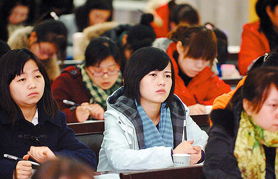 12月1日,陕西省咸阳市乾县临平村主任助理侯娟娟(中)在开班仪式上。当日,陕西省女大学生“村官”能力建设培训班正式开班,104名女大学生“村官”接受培训。2008年,陕西省首批2080名优秀大学生到村任职,其中女大学生“村官”924名,占总人数的44.4%;2009年,又有2975名优秀大学生到村任职,其中女大学生“村官”占总人数的51.3%。 新华社记者 丁海涛摄