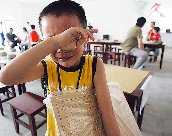 2005年6月25日,武汉市青少年宫围棋班,一位男孩因下课后家长没有及时来接而伤心落泪。