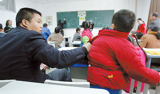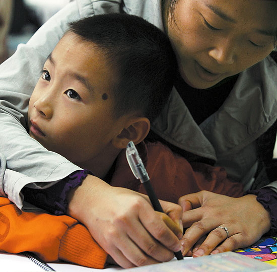 2009年10月11日,武汉市青少年宫一堂培优课,临近放学,一位小朋友还没完成老师布置的课堂作业。情急之下,母亲亲自上阵,手把手教儿子写作业。