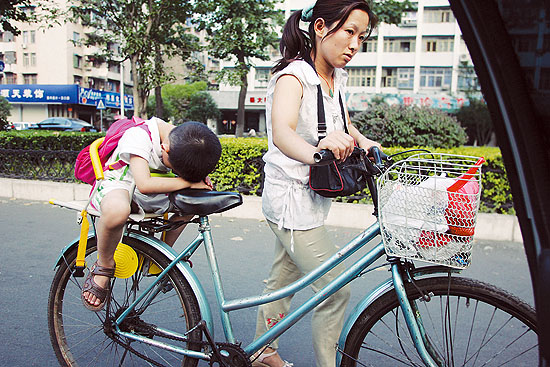 2005年6月4日,武汉市建设大道,一位母亲骑车驮着疲惫的孩子回家。