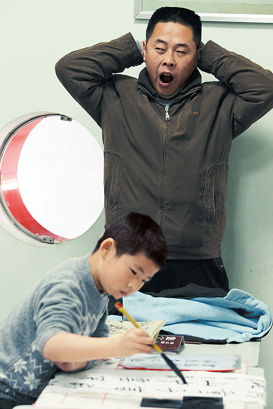 2009年11月15日,武汉市青少年宫书法班,一位陪练的家长困了。