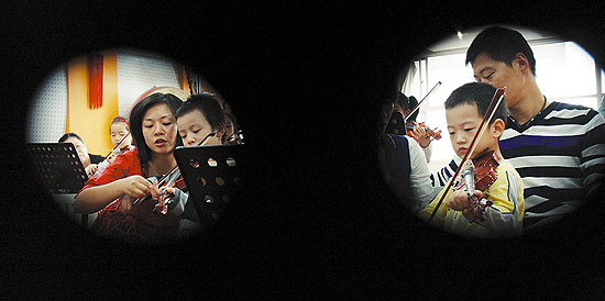 2009年10月31日,武汉市青少年宫小提琴班,孩子在家长的陪同下练习小提琴。