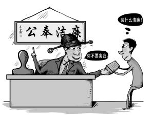 1998年春节前,其下属来到汪某某办公室说:“汪局长,过年不给你买什么东西了。”同时把一个装有1万元的信封往汪的抽屉里塞。汪嘴上虽说“不要害我”,仍收下了。漫画:付业兴