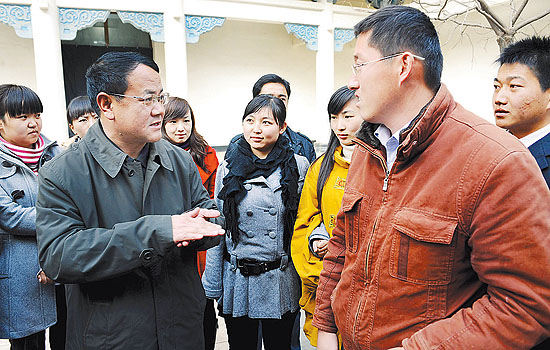 陕西省延安市宝塔区区长阚延军(前左一)近日与参加培训的大学生村官们在一起交流。当日,延安市宝塔区将近两年担任村官的93名大学生进行集中培训。 新华社记者 陶明摄