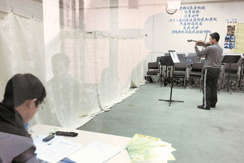 12月5日,北京市高考艺术特长生统测在清华大学举行,统测项目包括声乐、器乐、舞蹈、戏剧、书画5类。考场内,考生和评判老师隔着一层布帘进行考试。