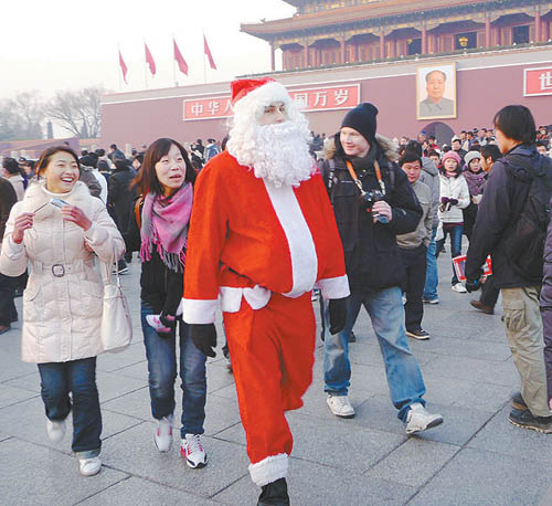 12月6日,一位打扮成“圣诞老人”的外国游客在北京天安门广场游览,引得众人竞相与其合影留念。“圣诞节”伴随着慈祥的圣诞老人和“铃儿响叮当”的欢快乐曲,逐渐成为我国年轻人追崇的时尚。说其崇洋媚外也好,忘记传统也罢,但这的确是一个不争的事实。热闹之后我们应该思考,为什么如今我们国外的节日过得越来越火,自己的传统节日反倒冷清了呢。重拾传统,并不意味着远离圣诞甚至拒绝圣诞,我们不妨借鉴下西方文化的一些细节表现方式,融入到自己的传统文化和节日仪式当中。