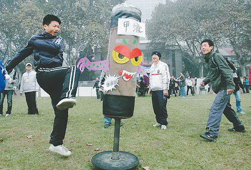 12月1日,一场以“抗甲流”为主题的趣味运动会在西安交大田径运动场展开,一个“甲流病毒”沙袋成了同学们挥舞拳脚的对象。鉴于当前甲流形势严峻,该校目前实行了半封闭式管理,为鼓励学生们参加运动,策划了这样的活动。提起甲流,大家恨之入骨,都想“人人得而诛之”,但甲流病毒看不见、摸不着,让人们无可奈何。感谢那位有材的同学,把甲流具象成为人们可踢打的沙袋。虽然不能身临现场,但看了照片,也让人多少有些出气的快感。