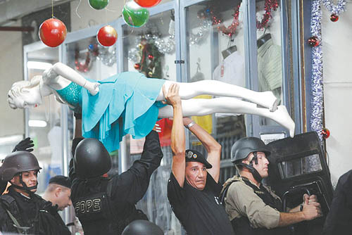 这不是一场时装秀的后台,而是警方在处置人质劫持事件。12月3日,巴拉圭亚松森,某商场的店主遭劫持并被索要70万美元。警察赶到后,试图用衣模砸门进入。我们在担心被劫持人质安全的同时,不得不佩服这几位警察的急中生智。看到此场景,突然联想起香港演员周星驰演的一部谍战片,剧中的主人公把椅子当做武器,吹风机还能当刮胡刀使。这个妙用的衣模告诉我们,生活中原滋原味的幽默,永远比人想象编造的更真实、更自然、更戏剧化。或许星爷看到这张照片,也会灵机一动,在以后某部电影中移植这样的“创意”。