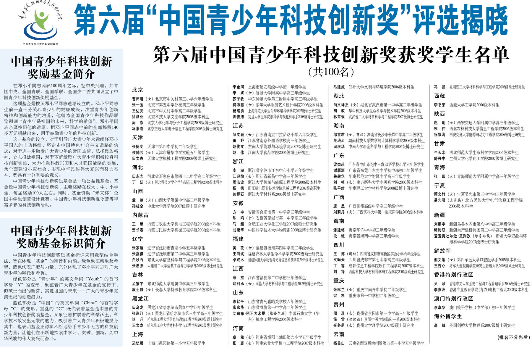 第六届“中国青少年科技创新奖”评选揭晓