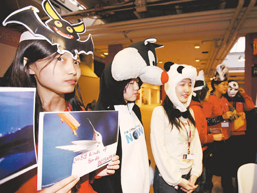 12月9日,在丹麦首都哥本哈根联合国气候变化大会举办地贝拉中心,中国青年代表团的团员装扮成受气候变化影响即将消亡的物种,号召人们立即行动起来保护环境。