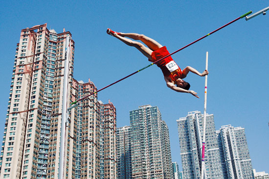 12月11日,在中国香港举行的东亚运动会上,中国运动员齐海峰在男子10项全能的撑杆跳比赛中,附近林立的高楼成了他越过横杆的背景。阿忆摄