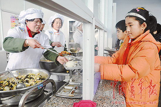 12月15日,吉林省敦化市大桥乡中心小学的孩子们在“希望厨房”里吃上了美味的午餐,当天,该校的“希望厨房”正式落成。“卡夫希望厨房”由中国青基会和卡夫食品共同发起,致力于改善农村学童的膳食营养水平,并提高农村教师、厨房工作人员及学生家长的营养健康意识。该项目计划于2009年底前在100所希望小学修建100个“卡夫希望厨房”。本报记者 周凯摄