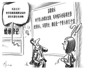 沈阳市大东区婚姻登记处办理结婚登记的展板上温馨提示:男人偶尔出轨不必看重。(《成都晚报》12月17日)漫画:徐简