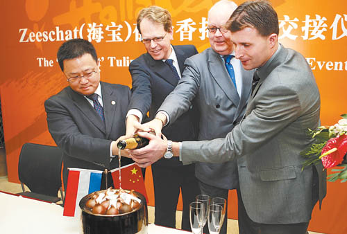 当日,上海世博会荷兰国家馆举行仪式,向上海世博会组织方赠送特别为上海世博会培育的新品种——橙色郁金香“海宝”。中国2010年上海世博会吉祥物是海宝,取名“海宝”的橙色郁金香具有象征中荷两国人民长久情谊的意义。