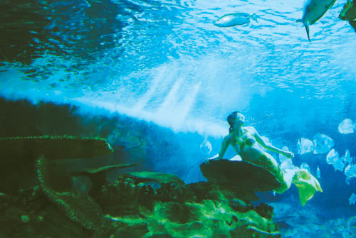 “扑通”,11点美人鱼入水了,下面的“海底隧道”里,立即响起游客们兴奋的呼声。“美人鱼!”“哇!好美啊!”“是真人么?是么?”“在那儿!在这儿!”无论是大人还是孩子,这一刻似乎都相信了童话,他们在隧道里来回奔走,寻找美人鱼的踪影,看到美人鱼冲他们招手,会兴奋不已,快门声不断。美人鱼尽管戴着蛙镜,嘴角却一直是保持着微笑,在水里转上几圈,和海龟跳上一曲,抓上一把沙子便能引来一大群鱼儿的环绕,那一刻游客们模糊了现实与幻境。