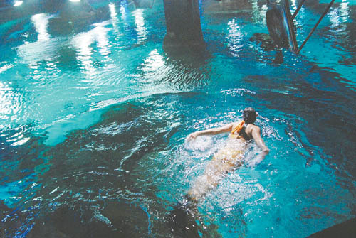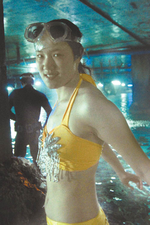 林琳回到更衣室迅速的吃上几口早点,熟练地换上一身比基尼,两三分钟后,她已坐在池边,套上银光闪闪的鱼尾,穿上脚蹼,往身上撩撩水,水温26摄氏度,比一般游泳池稍低一些。