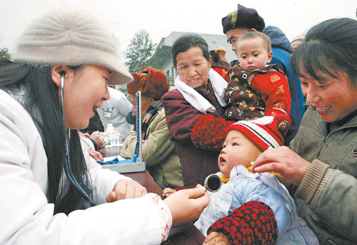 12月22日,四川华蓥市庆华镇斜滩村的村民在家门口接受免费的医疗健康服务。从12月上旬开始,四川省华蓥市组织全市医疗机构的专家及志愿者,开展旨在关爱百姓健康、提高农民健康水平的“健康之路村村行”活动。该活动除对全市农民群众进行免费义诊外,重点还对农村优抚对象、五保老人、特困群众、贫困党员及65岁以上老党员、老干部,免费开展送医送药送健康知识活动。