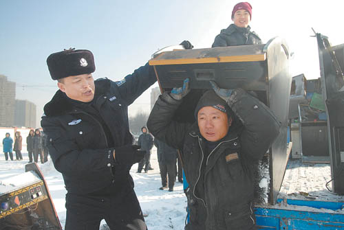12月23日,工作人员搬运准备公开销毁的赌博游戏机。