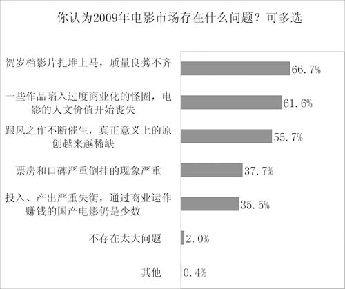 2009年的电影市场存在什么问题?调查中,66.7%的观众认为贺岁档影片扎堆上马,质量良莠不齐;61.6%的人表示,一些作品陷入过度商业化的怪圈,电影的人文价值开始丧失;55.7%的人认为跟风之作不断催生,真正意义上的原创越来越稀缺;35.5%的人则表示,国产电影的投入、产出严重失衡,能够通过商业化运作赚钱的电影仍是少数;37.7%的人觉得问题是票房和口碑严重倒挂的现象严重。