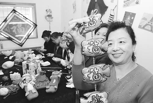12月23日,青岛市市北区镇江路街道居民王秀珍(右一)在展示客户预订的福鱼手工挂件,准备组织姐妹批量生产。