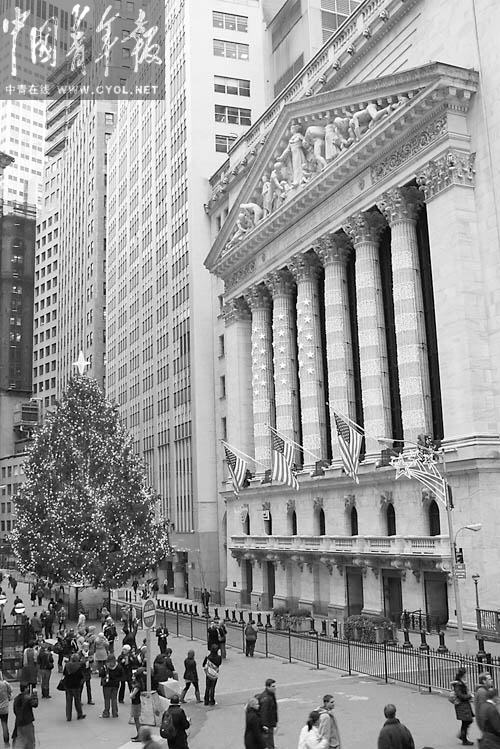 位于华尔街上的纽约证券交易所门前,早早布置好了圣诞树等饰品,准备迎接2009年的圣诞节,并辞旧迎新。