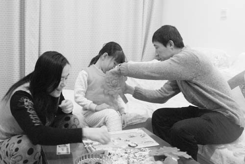获得第二届“振兴杯”大赛钳工第三名的孙家宇,与妻子、女儿在自己刚装修完的新家中,为女儿佩戴自己刚获得的大红花。在今年的年终总评中,他获得单位多项表彰。