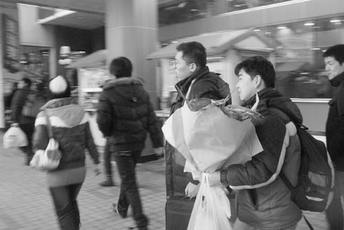 12月25日下午3:40,到达沈阳北站的内蒙古选手,捧着志愿者们献上的鲜花走出站台。