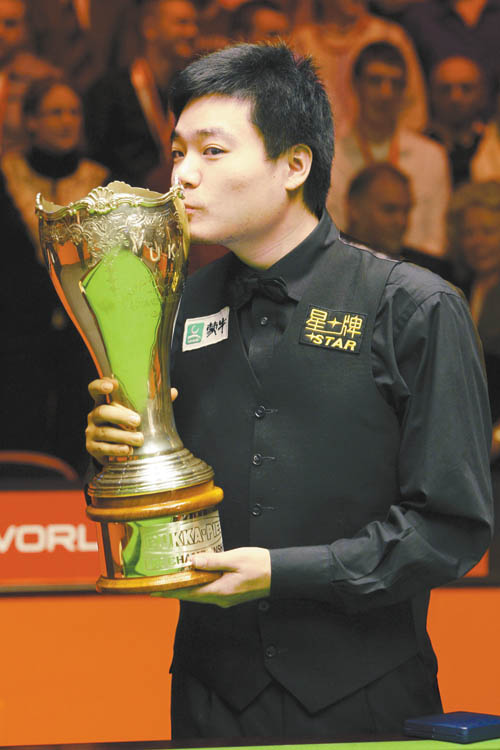12月13日,丁俊晖战胜希金斯,再次捧得英锦赛冠军奖杯。