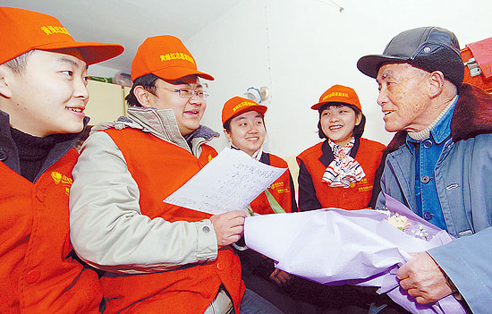 1月1日,“黄绿红”志愿者服务队的志愿者与鲁传榜老人拉家常。