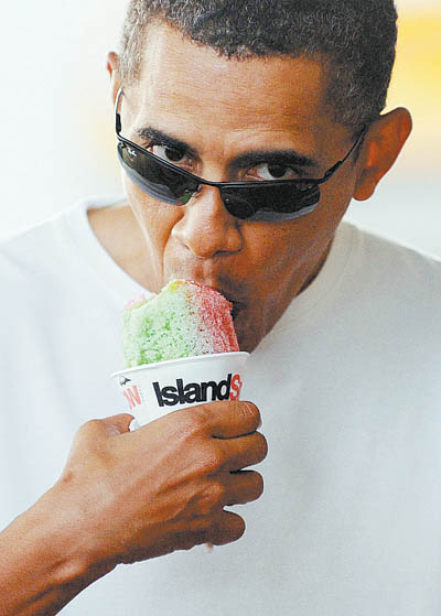 2010年新年第一天,正在夏威夷休假的美国总统奥巴马吃着冰激凌面对媒体镜头。当天,打完高尔夫球后,奥巴马带着两个宝贝女儿和10多个朋友来到一家冷饮店品尝刨冰。奥巴马之前曾和女儿光顾过这里,精明的商家已经将他上次选的刨冰口味取名为“雪巴马”列在菜单上。总统愉快地回答着记者提出的八卦问题,还拿身旁的朋友开涮。奥巴马的出现,吸引了数百人围观,他们争睹总统和总统女儿的风采。