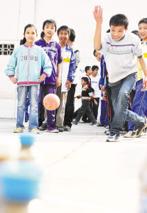 1月5日,在广西南宁市裕兴学校,20多名志愿者与农民工子弟在做游戏。裕兴学校是一所民办农民工子弟学校,1000余名学生中95%是农民工子弟。 新华社记者 周华摄
