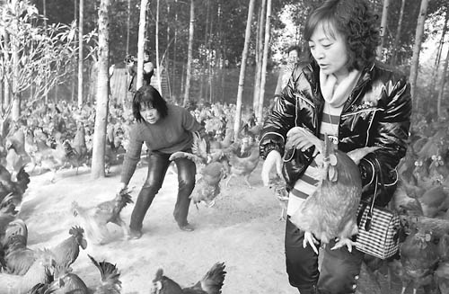 1月12日,来自四川成都市区内的市民在双流县永安镇双坝村大学生丁勇开办的土鸡养殖场选购“过年鸡”。2005年毕业于四川成都旅游学院的丁勇,2007年放弃在大城市的导游工作,到双坝村承包了130亩荒山,栽植经济林木,去年秋天他利用已成林的巨桉树林饲养了1万余只土鸡。春节即将来临,“生态土鸡”引来不少城里人购买。