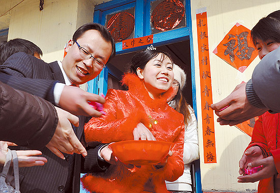 26岁的祝洪章和25岁的于丽丽都是山东诸城市人,2008年9月,两人分别被选聘到山东省沂蒙山区沂南县张庄镇小河村和涝坡村任村主任助理。他们在工作过程中相互帮助,相知相恋,喜结良缘。杜昱葆摄