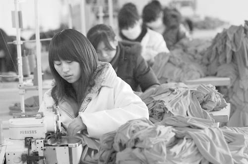 1月27日,阜阳市颍州区程集镇返乡农民工创业园内一家服装生产厂的工人在工作。