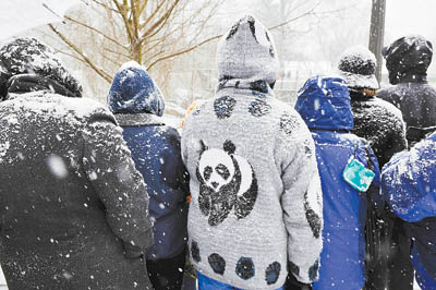 美国熊猫迷冒雪送“泰山”