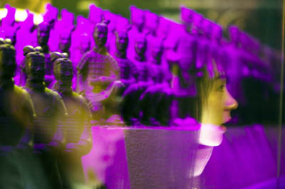 1月29日,一名女游客在观赏用巧克力制作的秦始皇兵马俑。当日,位于北京奥林匹克公园的世界巧克力梦公园正式向游人开放,560尊微缩秦始皇巧克力兵马俑吸引了大量游客。