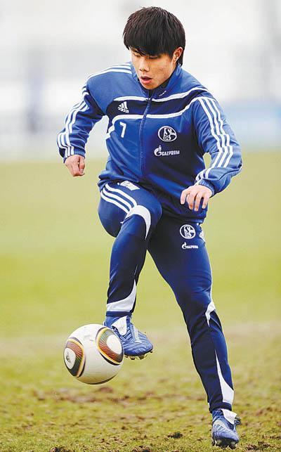 当地时间2月2日,刚刚加盟德甲劲旅沙尔克04队的中国球员蒿俊闵,身着7号训练服,参加球队首训。