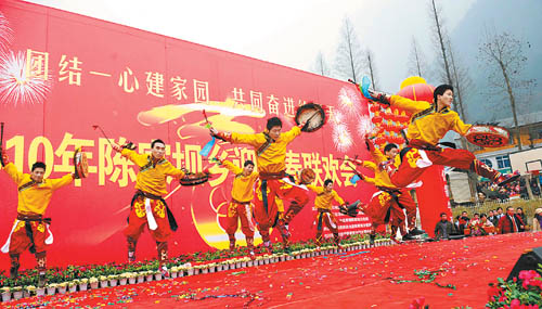 2月7日,陈家坝乡的羌族民间艺术团演员在表演“羊皮鼓舞”。当日,四川北川地震极重灾区陈家坝乡“团结一心建家园共同奋进绘明天”迎新春联欢会在青岛援建的海信陈家坝小学操场上举行。联欢会上,来自乡镇机关的工作人员、学生和群众表演了丰富多彩的文艺节目,并有2000多名群众观看了演出。