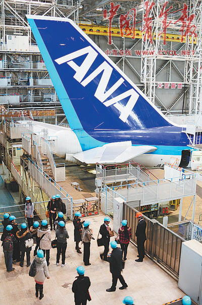 访日团团员参观日本全日空航空公司机体整备工厂。