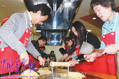 在广岛,访日团团员在学习制作一种当地特有的料理。