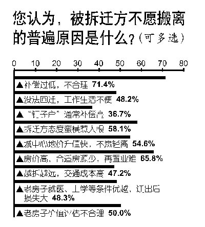 对于被拆迁方不愿搬离的普遍原因,此次调查中,71.4%的人首选“补偿过低,不合理”;65.8%的人认为是“房价高,合适房源少,再置业难”;58.1%的人表示“拆迁方态度蛮横惹人恨”。