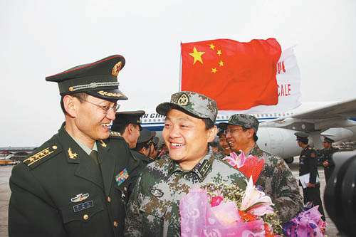 2月10日7时45分,圆满完成赴海地医疗救援任务的中国医疗防疫救护队返抵北京首都国际机场。这是一名救护队队员(前右)和前来迎接的战友交谈。