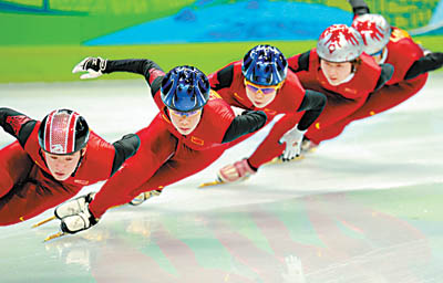 当地时间2月10日,中国短道速滑选手在温哥华适应场地。