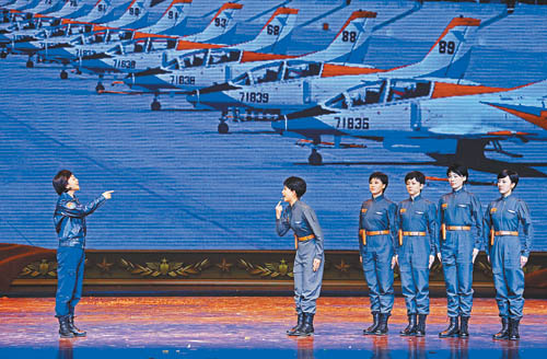 2月8日,演员在排练《我心飞翔》。小品《我心飞翔》再现了国庆60周年大阅兵前夕,要在5名参加空中受阅梯队的女飞行员中,确定一名“备份”队员的故事,展现出女飞行员们勇挑重担的拼搏精神。
