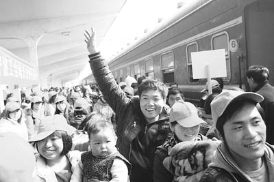 2月22日,在宁波火车南站,一名工人与前来接站的同事打招呼。当天,宁波一家服装企业包了L8439次列车的6节车厢,将春节返乡探亲的550余名安徽阜阳籍员工接回宁波上班。