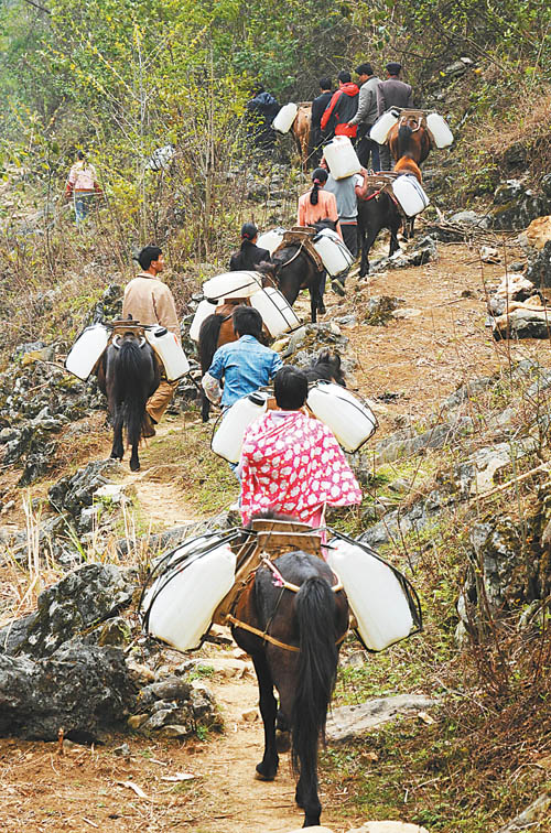 2月23日,广西东兰县东兰镇达文村群众用马驮水回家。