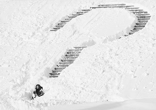 2月25日,在芬兰首都赫尔辛基市中心的大教堂外,被积雪覆盖的台阶上出现一个问号形状的痕迹。 新华社记者 赵长春摄
